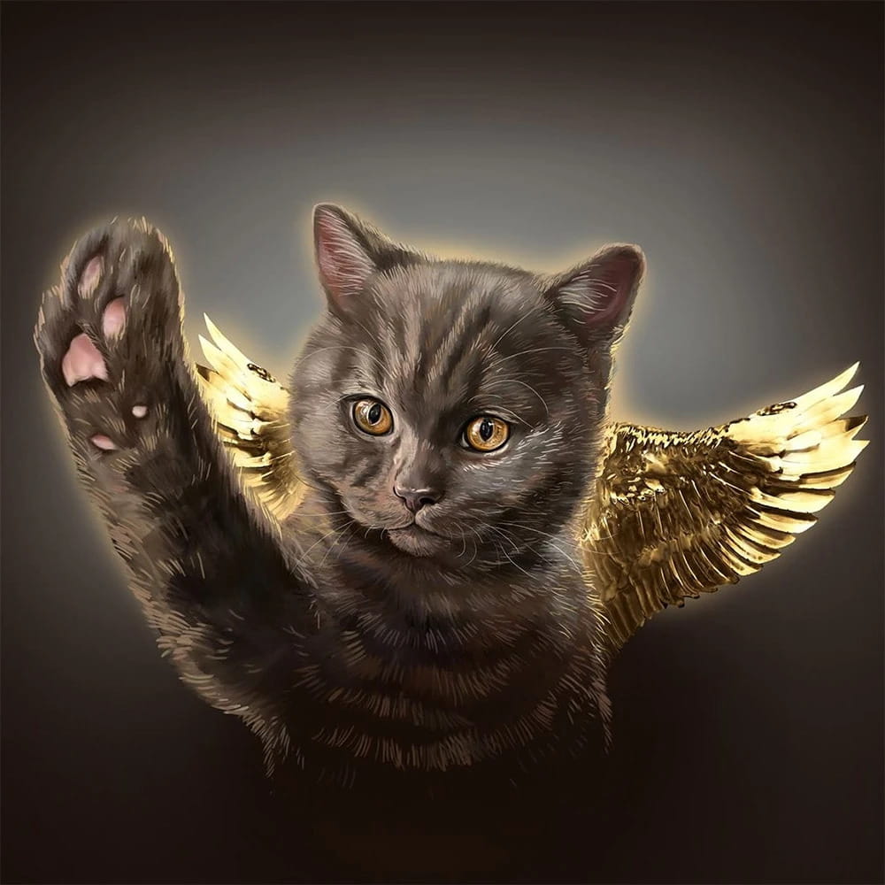 Unser "Engel Stil" verwandelt dein geliebtes Haustier in ein himmlisches Kunstwerk. Handgemalt von unseren Künstlern, ist dieser Stil ideal, um verstorbenen Begleitern zu gedenken. Die individuell gestaltbaren Flügel – ob klassisch weiß, golden oder im feurigen Phoenix-Look – machen jedes Bild einzigartig.