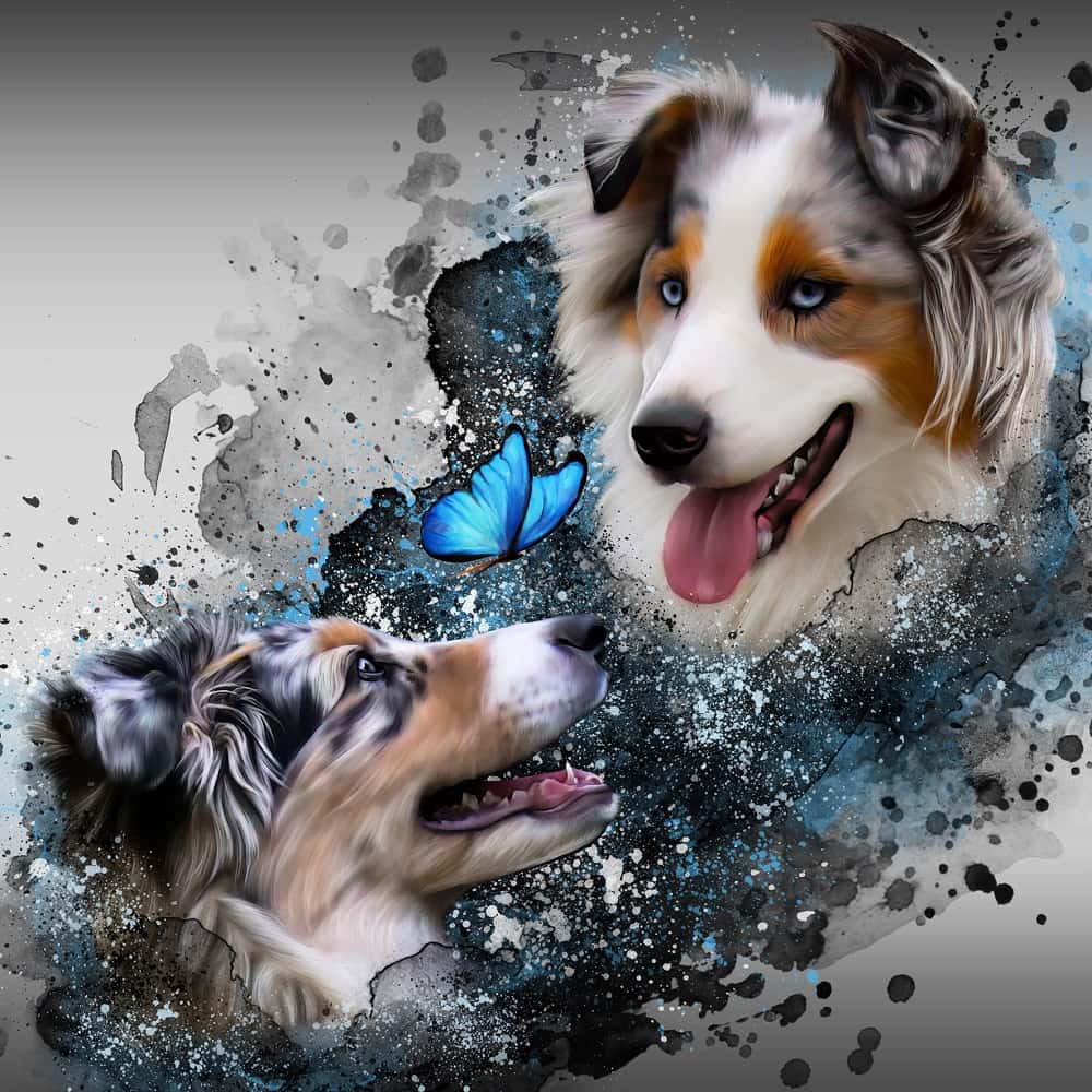 Unser "Butterfly Stil" kombiniert handgemalte Haustierporträts mit einem schillernden Schmetterlingsschwarm. Je nach